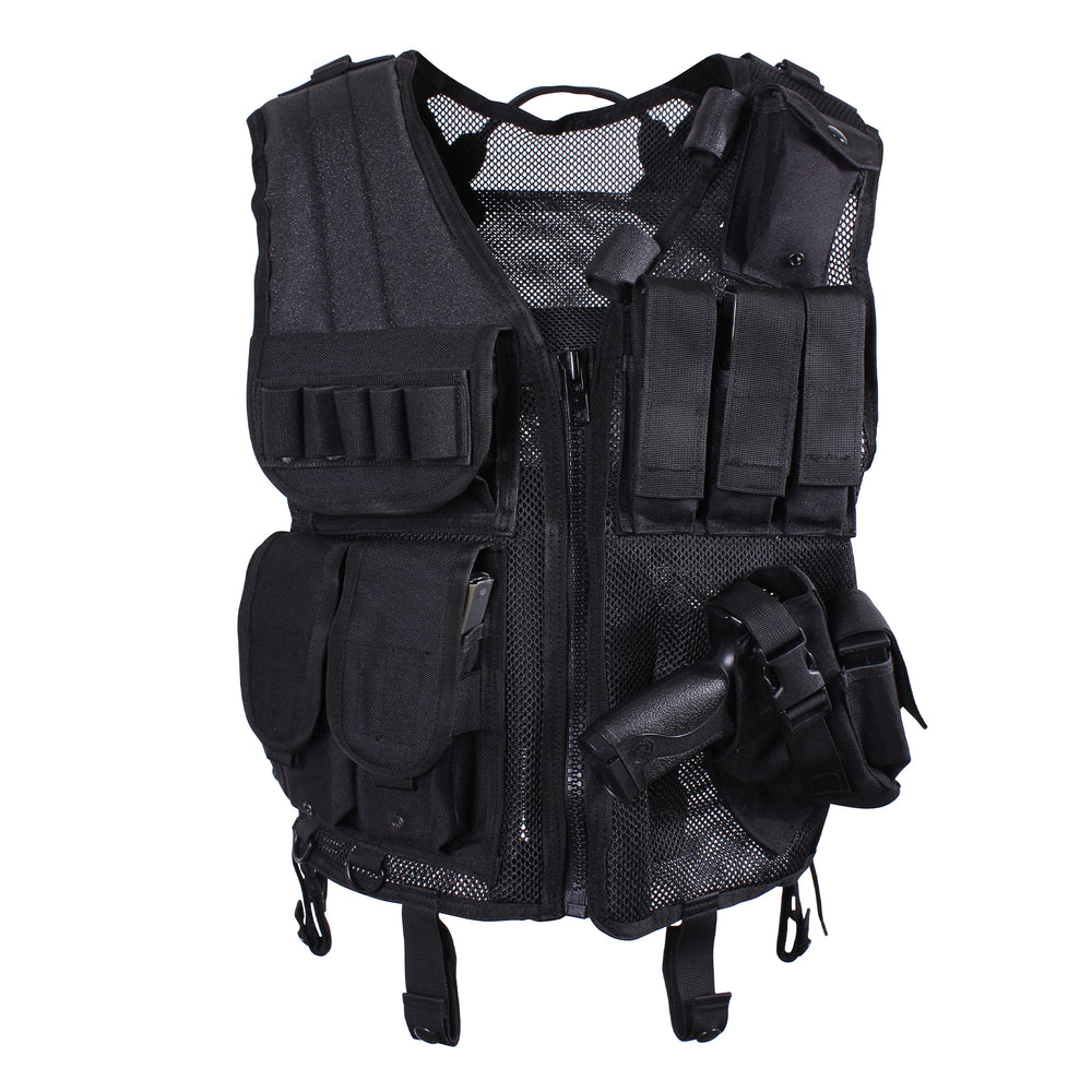 Maintain quick access to your firearm and ammunition with Rothco’s Quick Draw Tactical Vest. A universal pistol holder is strategically placed on the left-hand side for efficient right-hand draw, designed to fit any full-size frame handgun. The left- chest on this tactical vest includes a triple pistol mag pouch for storage of ammunition while three rifle mag pouches at the bottom of this assault vest allow for increased ammo storage. This military vest also includes 5 shotgun shell loops. Dual padded load bearing shoulder pads, with the right shoulder padded for bracing weapons, lends comfort to this tactical gear vest. A hidden pocket for storing a spare cuff key is incorporated into this quick draw vest while inside pouches allow for increased equipment storage. The hook & loop panel on the back of this ammo pouch vest allow for an ID panel attachment while backside also features All-Purpose Lightweight Individual Carrying Equipment (ALICE) clip webbing. This airsoft vest includes 4 metal D-rings on bottom, and one on each shoulder while belt straps on the bottom of the combat vest to fasten to any size belt. One size fits most due to the adjustable sides of this duty vest, that can comfortably extend up to 20.5 Inches, and this pistol holster vest is secured through right hand zipper closure. Rothco’s Quick Draw Tactical Vest is constructed with 600D polyester to withstand any mission, with nylon mesh contributing to the holster vest’s breathability.