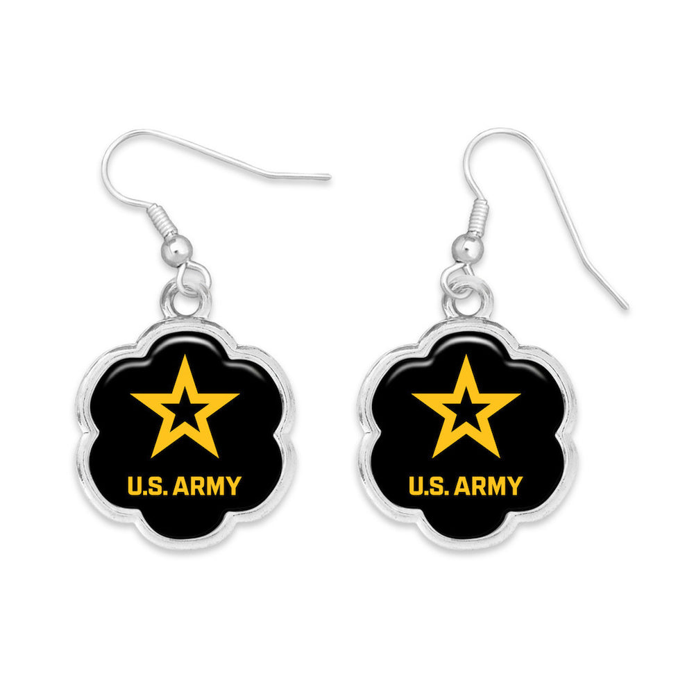 Match your outfit with these captivating U.S. Army Hazel Earrings beautifully perfect to wear and suits every outfit. This Earring has an army logo charm and a round flower style.