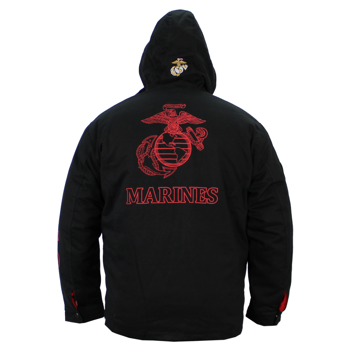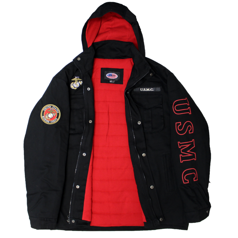 Stay warm in this impressive black Heavy Canvas Jacket, featuring a hood lined with red thermal cotton to showcase your MARINE pride. Made from durable 100% cotton, this jacket includes two breast pockets with snap closures and two hip-level pockets for added convenience. For extra comfort, it's lined with 100% red cotton thermal insulation combined with polyester fill, and it features both a zipper and a protective flap with silver snaps. The jacket is adorned with the Globe and Anchor emblem on the right chest and “U.S.M.C.” on the left. The back boasts a screen-printed red Marine logo, while the hood displays an embroidered logo. Additionally, the left arm features “USMC” screen-printed in red, and the right arm showcases an embroidered Marine logo.